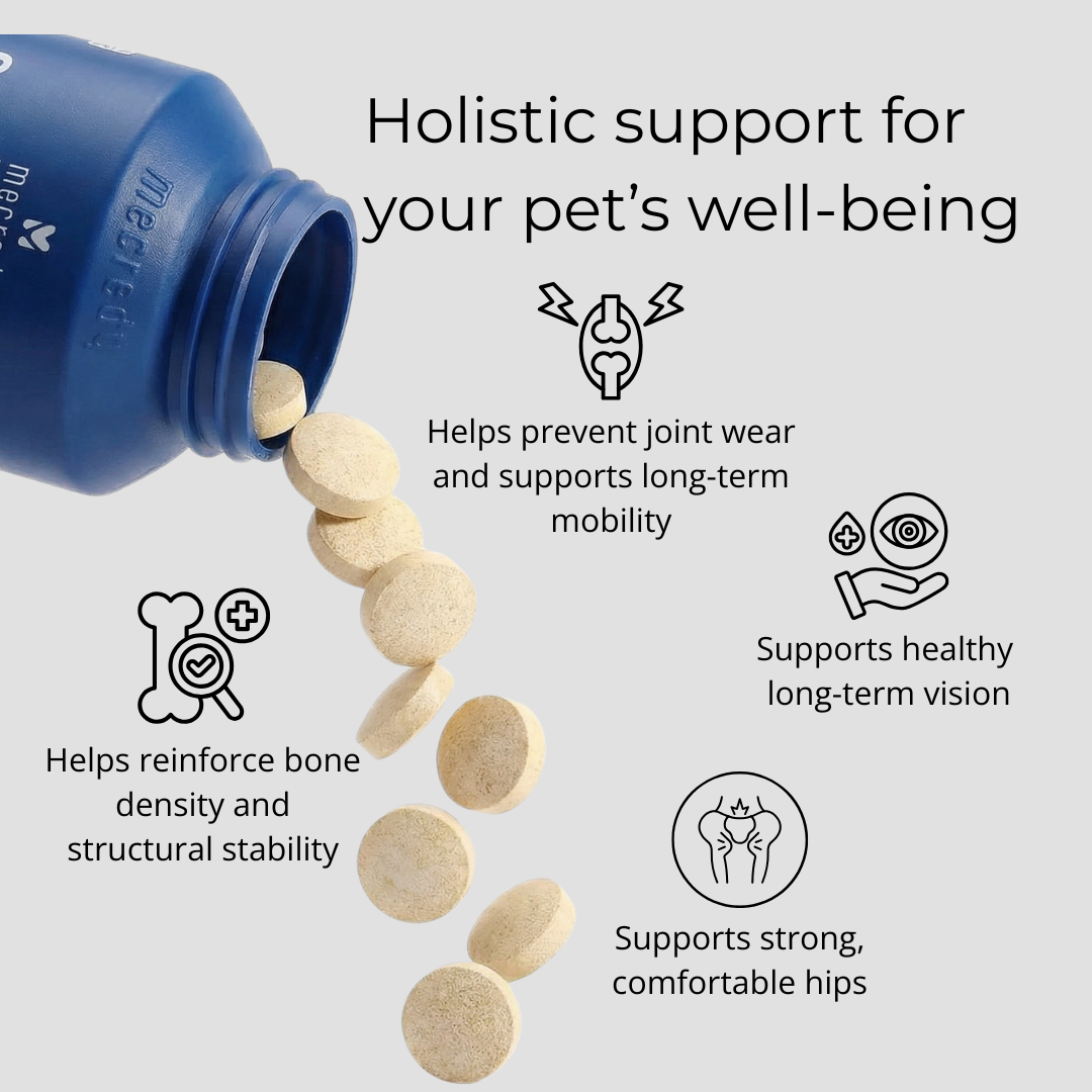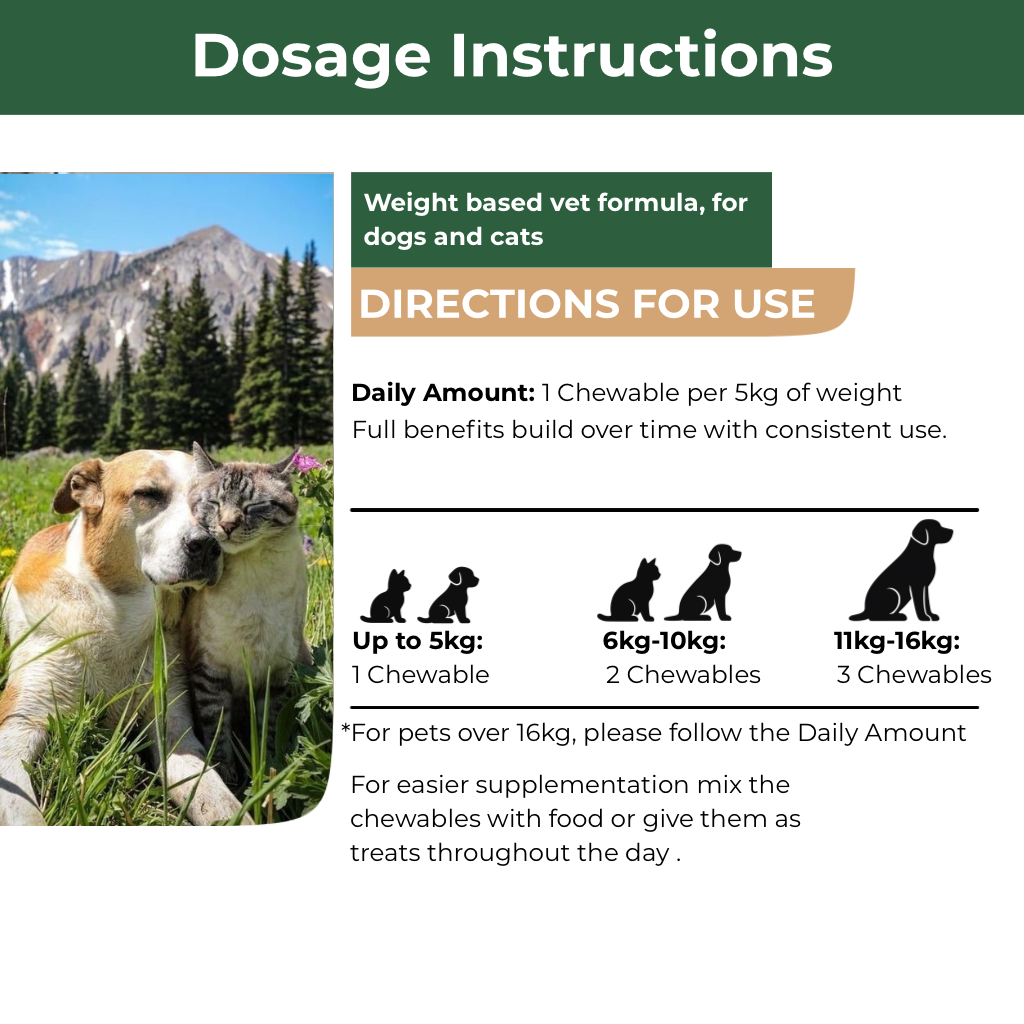 Our supplements are developed using evidence-based nutritional science and created in partnership with veterinary professionals. Every formula is designed to support key systems like mobility, digestion, immunity and overall vitality. We focus on bioavailable nutrients, ensuring your pet can absorb and use them effectively.