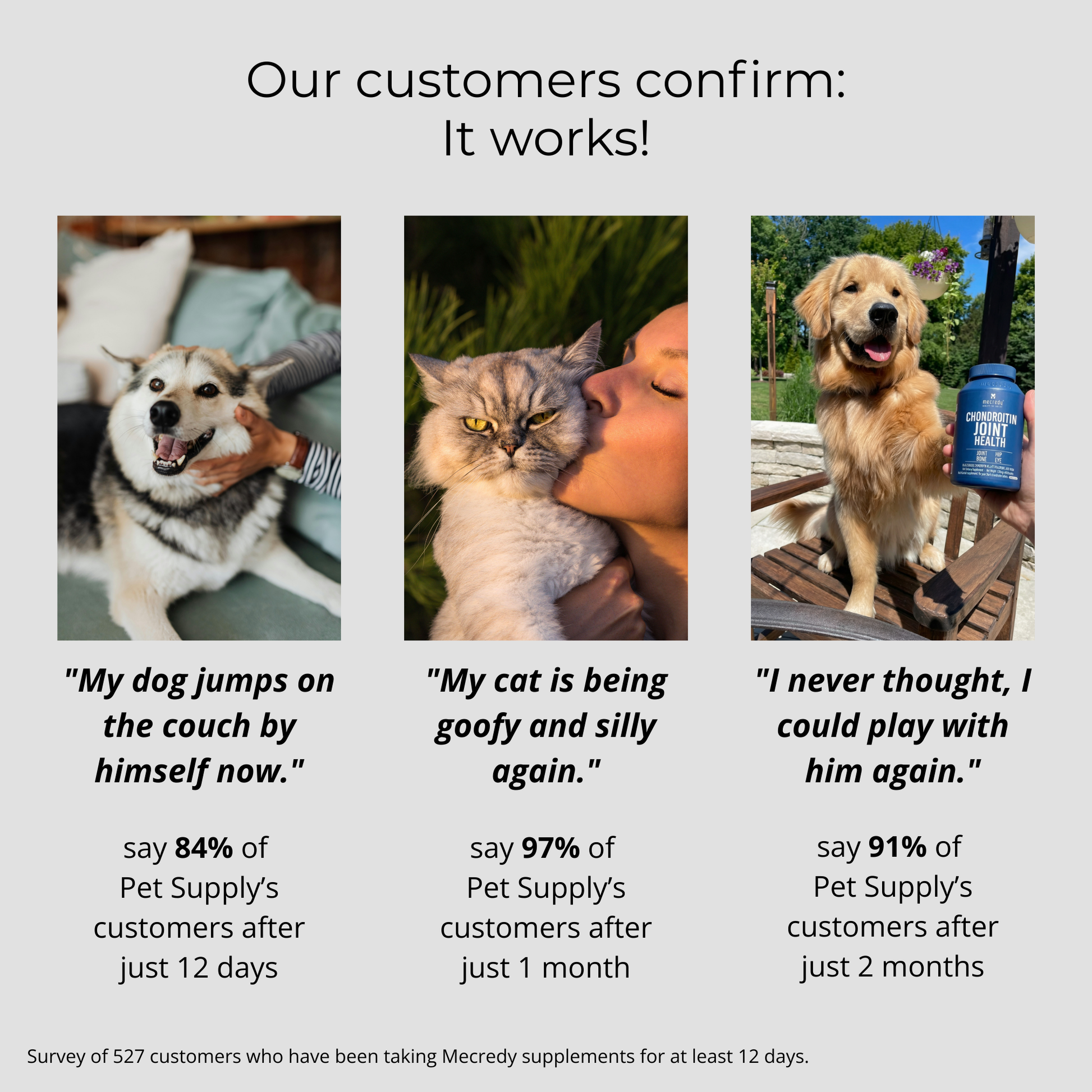 At Pet Supply’s, we combine European sourced ingredients with advanced laboratory technology in China to deliver premium, vet-approved formulas. Our supplements are designed for faster, more noticeable results and backed by a 60-day money-back guarantee.