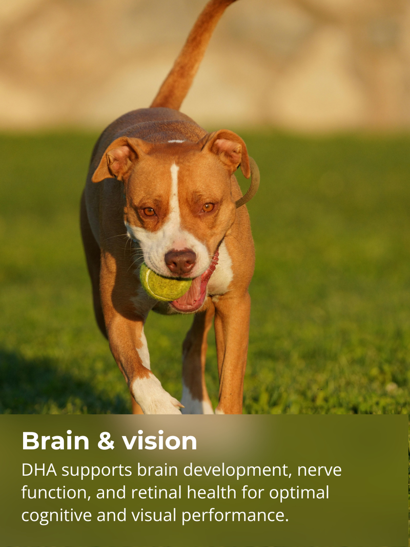 High-dose DHA enhances brain signaling and eye health, improving focus, learning response, visual clarity and mental alertness in puppies, kittens, senior pets and highly active companions.